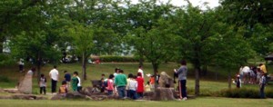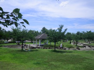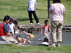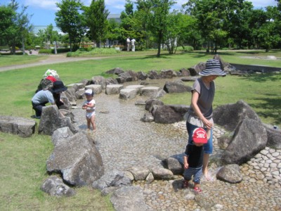 早くも真夏日を記録しました。涼を求めてせせらぎで遊ぶ親子です。h
