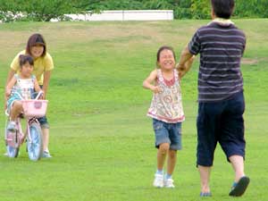 広場で自転車の練習に励む親子。上手に乗れるようになったかな? h
