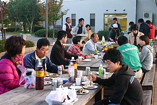 美しい紅葉の下 おいしいお肉や魚介に舌鼓 皆さん わいわい盛り上がりました k
