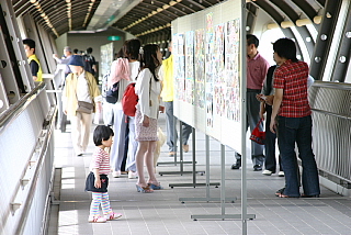 スカイウェイから花の広場を望む。雨に濡れずに花壇を楽しめます。