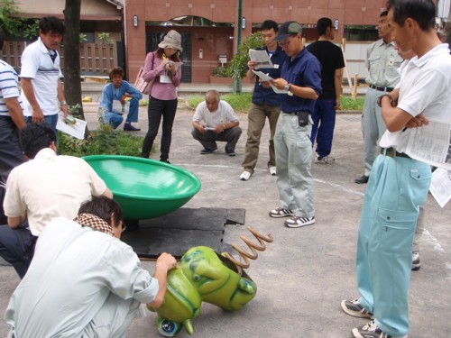 遊具の日常点検講習会に参加してきました。 小雨の中点検ポイントなどを勉強しました。 h